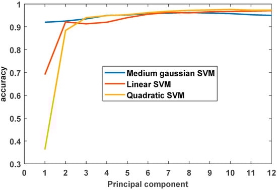 The Figure 11 shows the accuracy of the svm algorithm with different numbers of principal components retained. The horizontal axis represents the 12 eigenvalues mentioned above, and the vertical axis represents the accuracy of the model prediction. We conducted experiments on three SVM algorithms with different kernel functions, namely Medium gaussian SVM, linear SVM and quadratic SVM. According to the broken line graph, it can be clearly seen that when more than six principal components are selected, the accuracy tends to be flat; thus, we think it is reasonable to keep 4–6 principal components. We think this can alleviate the problem of data redundancy to a certain extent.