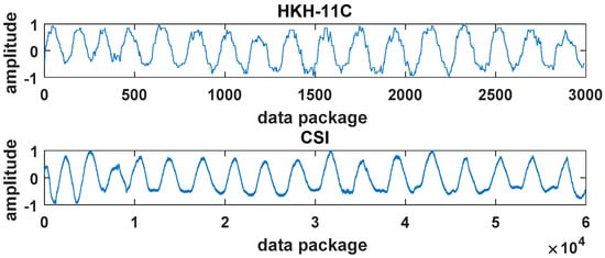 The HKH-11C wearable breathing sensor mentioned above is selected for the comparative experiment. Figure 12 shows the comparison diagram of CSI data collected by HKH-11C wearable respiratory sensor and this system at the same time and place within 1 min. In the comparison test, subjects wore HKH-11C breathing sensor and sat between two USRP devices for breathing movement. Figure 12 shows the breathing waveform in a period of time, while Figure 13 shows the Cheyne-Stokes respiration waveform in a period of time.