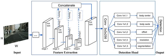 Feature extraction takes the image as input, and the output is a fused feature map at 1/4 the size of the image. The backbone extracts the input image features, we obtain the four stages output of the feature map, transpose these four feature maps, attach L2-normalization and concatenate these four feature maps. In the part of the detection head, the fusion feature attaches a convolutional layer with kernel size 3 × 3 and attaches four convolutional layers with kernel size 1 × 1 to predict the center, scale, offset, resolution region and segmentation. The offset output prediction is adopted to refine the position of the center, and the resolution output indicates region resolution learning prediction.
