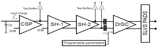 The architecture of a single-channel FEE is shown in Figure 1. The complete design is composed of four similar channels. The design has been realized in TSMC 65 nm CMOS technology. The input signal of each channel is a current pulse coming from the sense wire of the detector. The input signal is converted into a voltage pulse by the charge-sensitive preamplifier (CSP). The CSP’s output pulse is amplified and shaped by the two-stage bipolar shaper (SH1, SH2). The CSP and shaper together constitute the analog signal processing chain of the design, which is connected with the discriminator through coupling capacitors. Two programmable DACs are used to set the threshold value for the discriminator. The discriminator compares the bipolar signal with the threshold value to yield the output, time-over-threshold. SLVS drivers are designed to provide an interface for the individual FEE channels with the subsequent TDC chip. Test-point buffers are added at the output of CSP and the shaper for diagnostic purposes. A central bias block has been designed, which mirrors the current to each channel from a reference source of 50 µA.