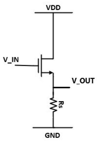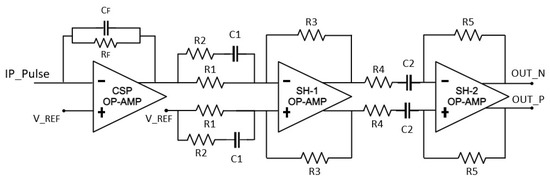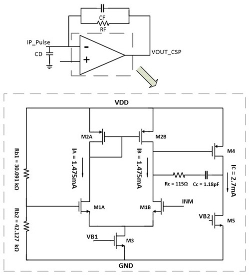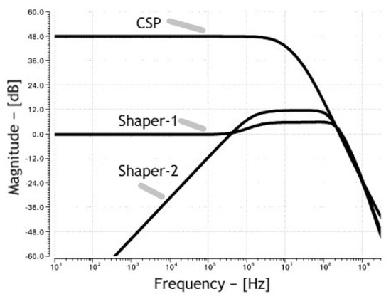 The load impedance of the CSP stage is the input impedance of shaper-1. It is a parallel combination of a resistor, R, and a series connection of a resistor and a capacitor—R and C, respectively. The CSP transfer function depends on the feedback network, the transconductance of the input transistor (M1A–B), the load impedance Z and the detector capacitance C. The CSP transfer function can be approximated by Equation (1).