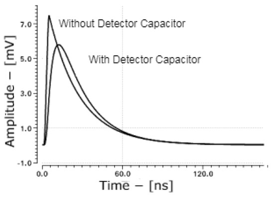 The most important performance parameters of the CSP in our design are the peaking time delay and signal-to-noise ratio. The peaking time delay is important for the precise determination of the arrival time of the signal, given the wide range of signal amplitudes as they occur in the experiment. CSP noise and the speed of response are optimized by using a suitable input device transconductance (gm1). The differential input transistors (M1A–M1B), of size W/L = 580 um/330 nm, operate in moderate inversion (to mitigate the increase in power consumption) with a nominal current of 1.475 mA in order to have very large transconductance, gm1 = 25 mA/V. This is in accordance with the minimum thermal noise requirement. The input charge pulse for the FEE comes from a single source (the sense wire of the tube); thus, a single-ended topology has been chosen for the CSP, hence saving a current of 2.7 mA in the output stage of the amplifier, as shown in Figure 2. In this way, the use of common-mode feedback circuit is also eliminated. To minimize the peaking time delay, the OpAmp is designed with a very high unity-gain bandwidth of 2.4 GHz, with a phase margin of 60 degree, ensuring good stability. With these open-loop characteristics, the CSP exhibits a very fast peaking time of 4 ns without the detector capacitor and 11 ns with the large (60 pF) detector capacitor, as shown in Figure 3.