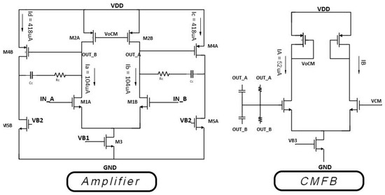 The Preamplifier stage is followed by a two-stage shaper section to implement bipolar shaping of the pulse in order to mitigate signal pile-up at high signal rates. Each stage of the shaper is based on two-stage differential amplifiers, as shown in Figure 5. The two-stage differential topology is more robust to the load and allows for a higher output voltage swing. The transconductance value of input MOSs is 2.5 mA/V and sinks a current of 104 uA in each input stage (Ia and Ib) and 418 uA in each output stage, as shown in Figure 5. The output-stage MOSs have been designed with an overdrive voltage of 70 mV (i.e., moderate inversion) to maximize the output swing range, and to achieve a linear sensitivity for the full range of input charges up to 100 fC. To set the common-mode voltage a separate common-mode feedback (CMFB) network has been designed. The W/L values of the CMFB network are half of those of the main amplifier input stage in order to reduce the current consumption. The CMFB network is attached to the main amplifier through a sensing network, consisting of a pair of resistors with capacitors in parallel for better performance at higher frequencies. The values of currents are given in Figure 5.