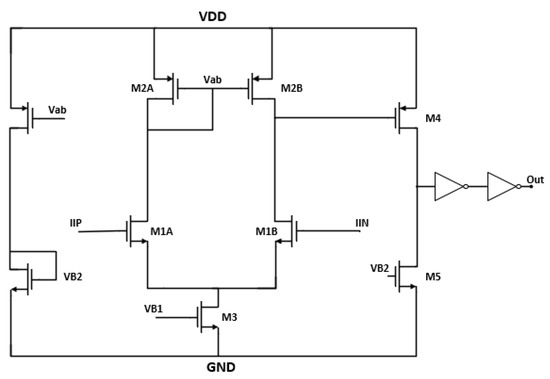 A hysteresis block is added with the comparator to unbalance the current in the main differential amplifier (M1A-M1B) according to a programmable value. Its significance is to remove glitches in the output of the comparator, which arise due to noise. The hysteresis can be varied from 0–50 mV by means of the programable digital word set externally at run-time.
