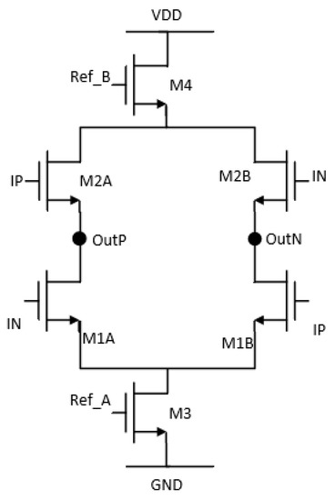 Modern experiments, such as ATLAS, consist of large number of data-processing channels. Consequently, decreasing power consumption and improving the data transmission rate of readout electronics is important. For these reasons, along with providing the CMOS-level signal at the output, SLVS drivers are designed for connecting the FEE channels with the external components of the TDC. The SLVS standard is defined in [7] and describes a differential current-steering protocol. It has a voltage swing of 200 mV, across a common mode voltage of 200 mV. The load resistor on the receiver end is of the value of 100 . At the output, the differential voltage is 400 mV and a current of 2 mA flows through the load resistor. The SLVS transmitter operates as a current source with switched polarity. The output current flows through the load resistance, external to the chip, building the differential output voltage swing of 400 mV. The proposed transmitter circuit, presented in Figure 10, uses the arrangement of four MOS switches in the H-bridge configuration [8,9], implemented with the M1–M2 (AB) NMOS transistors.