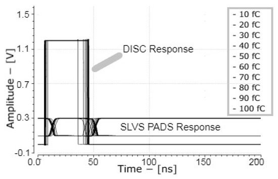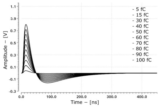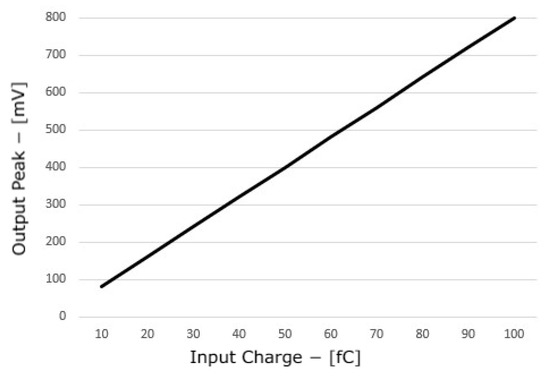 In post-layout simulations, the design was validated for different input charges (QIN) in the entire input range of 5–100 fC. The analog section output voltage ranged from 40 mV up to 800 mV for an input charge of 5–100 fC, as shown in Figure 11. Figure 12 shows that the analog chain exhibited a linear sensitivity (i.e.the peak-voltage of the curves vs. the input charge) of 8 mV/fC for the entire range of input charges. The design performance was also tested with respect to process, voltage, and temperature (PVT) variations to check for the robustness of the design. In PVT simulations, the design performance was tested with respect to different process corners (tt,ff,ss,fs,sf), a 10% variation in voltage supply, and a temperature range of 0–120 fC. In the worst case, the CSP exhibited a minimum sensitivity of 0.97 mV/fC and a maximum PTD of 14 ns.