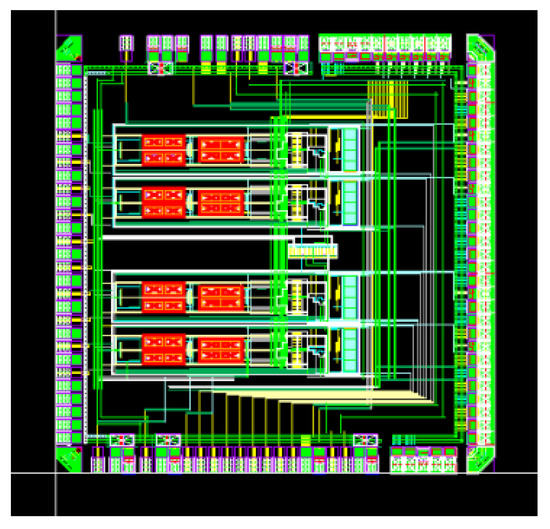 When the test point buffers in channel 4 were switched on, the sensitivity of this channel was reduced to 6 mV/fC due to the loading effect of the buffers. However under normal operation conditions, when the buffer switches were off, all the channels exhibited a uniform sensitivity. The analog chain had a constant peaking time delay of 14.6 ns for the entire range of input charges. The baseline recovery time, complete time duration of overshoot and undershoot, of the bipolar signal was almost 400 ns for the full input range of 5–100 fC. At the output pads, the time representation of the input signal is provided as both the CMOS level with a voltage level of 0–1.2 V and the low-voltage differential signal with a voltage swing of 200 mV across a 200 mV common mode voltage, as shown in Figure 13. The complete layout design is shown in Figure 14. Table 2 summarizes the most important performance parameters of the presented FEE for the MDT-ATLAS-read-out, compared with our reference design [3].