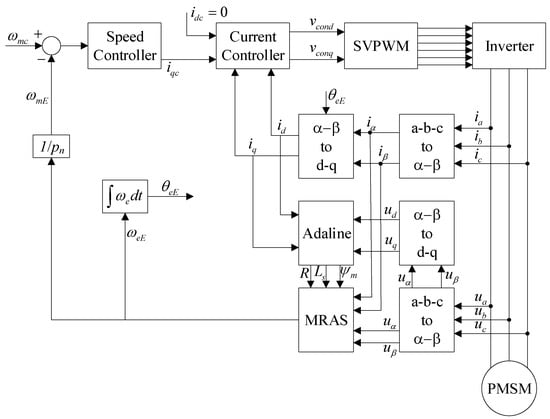 Motor control uses space vector pulse width modulation (SVPWM) control based on id = 0. The control system consists of the SVPWM control module, the MRAS module and the Adaline neuronal network parameter identification module. In the control system, uα, uβ, iα, iβ are used as the input to MRAS, ωeE is the output value of MRAS, ωmE is the estimated rotor mechanical angular velocity, ωmc is the given rotor mechanical angular velocity. ud, uq, id, iq are used as the input of the Adaline neural network, , R, and are identified through the Adaline neural network module. The specific parameters of the motor model in the simulation are as follows. The stator resistance is 1.55 Ω, the d-q axis inductances are 6.71 mH, the number of poles is 10, the rotor flux is 0.0455 Wb, and the back EMF is 17.4.