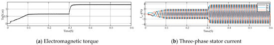 Figure 4b that the three-phase stator current gradually increases and reaches a stable state at the same time as the motor starts and the load torque. When the load changes suddenly, the three-phase stator current can also quickly return to a stable state. The accuracy of the mathematical model in this paper is verified by the simulation experiments, and the simulation model can meet the simulation requirements.
