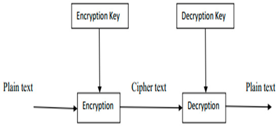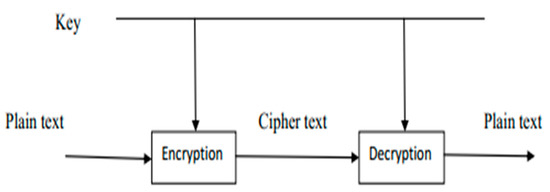 In symmetric keys, only one secret key is used to encrypt and decrypt a private key, and this also serves as an address between the sender and receiver of the message, as shown in Figure 2. If the unopened encryption key is used to send secret messages between two parties, each sender and receiver must have a duplicate key. Agrawal et al. [21] implemented private key cryptography to secure a system, as any intruder can steal the private key and open a document.