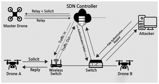 UAV networks can be vulnerable to various attacks, such as forgery attacks, man-in-the-middle attacks, etc. It is important to authenticate identities in UAV networks before the drones communicate with each other, as ensuring a legal drone in the network is the priority of UAV security. Software-defined network unmanned aerial vehicles (SDNUAVs) provide drone users a more flexible and supportive environment. Wireless SDNs provide a smooth environment for UAVs because the routers are connected with the controller and the drones are connected through wireless devices or a BTS. Such software-defined networks allow more featured algorithms to secure the vehicular ad-hoc networks or UAVs. Some issues in UAV networks, such as the hijacking of a drone, demand the strong protection of the northbound interface through various authentication mechanisms. In such scenarios, the software-defined networks (SDNs) provide a more flexible and supportive environment for all types of users, such as a single host user, an IoT network, a vehicular ad-hoc network, or a UAV network. Software is of primary importance for defining routes and packet switching [1]. In this environment, users define the protocols and algorithms themselves. The two major components of SDNs are the data plane and the control plane. Data planes are like dumb switches controllers that control these switches, and certain apps work in the controller, establishing a connection called (NBI) northbound interface. Similarly, when routers connect with the controller, it manifests into the southbound interface connection [2].