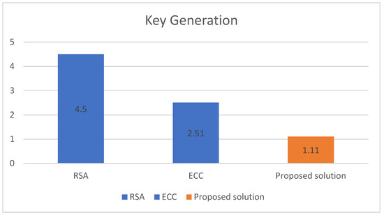 Figure 9 explains the statistical measurements of the three algorithms. The data about the algorithms represent the performance of these algorithms on, for example, the number of bits consumed during the encryption phase. These results demonstrate the performance of these algorithms and provides evidence for their evaluation in comparison with one another. It can be seen from the graph in Figure 10 that RSA has the largest peak value among the algorithms in terms of performance. The reason that it has the largest peak is that it consumes more bits than the other two algorithms during its encryption phase. This also suggests that the resources used for the algorithm’s execution will also increase. Meanwhile, the ECC algorithm also performed well, with it consuming approximately half the time the RSA algorithm did. An algorithm which consumes fewer resources but also performs well is preferable. Therefore, the ECDH algorithm could be said to have the best performance overall.