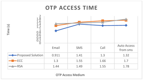 Figure 15 explains the one-time password authentication time. This graph shows that email took less time than other OTPs because there are multiple paths for OTP packets to reach the user’s email on the internet. In comparison, SMS uses GSM technology, which requires more time. However, auto access from SMS takes less time because the system detects the OTP automatically from the phone.