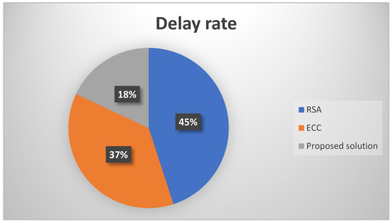 These three commonalities had a transmission rate of 90% and a data packet sharing rate of 65.93 percent, and the algorithm key generating delay time was almost 65 percent. However, the overall delay for RSA encryption was 45.67 ms. Many additional elements, such as power delays, influence latency. Each copy’s statistics indicate the success of the network’s encryption implementation. The data packet’s ratio to other packets (such as control set packets) is part of the data packet. The total delay of all packets is equal to the ratio of all delivered packets to all received packets, as shown in Figure 16. The average delay is a result of simulation. The line transmission rate can be disrupted if the current fluctuates rapidly. If the algorithm can use fluctuating power, the network will become increasingly congested, and the delay time will likely exceed 45.67 ms.