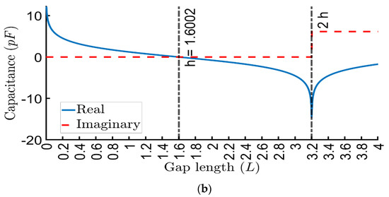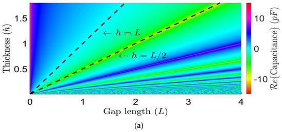 Figure 3 presents variations of gap capacitance Cgap which depends on the gap length L and the thickness h following Equation (5). Based on these simulated results, Equation (5) is only valid, i.e., the value of Cgap is real, when the gap length, L, is lower than two times the thickness h: L < 2 h. Moreover, Cgap decreases as the gap length increases and becomes negative as h < L < 2 h. Furthermore, the negative capacitance Cgap may result in unexpected behavior that can affect the functioning parameters.