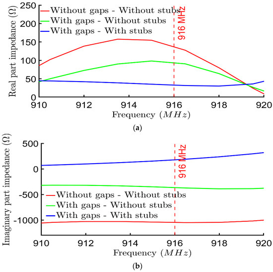 The first simulation study concerns the effect of adding gaps and stubs on the real and imaginary parts of the antenna’s impedance. As expected, the impedance of the structure varies, and its real and imaginary parts values become near to that of an industrial chip when introducing gaps and stubs as illustrated in Figure 6. Adding stubs as well as gaps influences more the impedance of the antenna because the imaginary part of the impedance can reach higher positive values and the real one can attain lower positive values, i.e., at f = 916 MHz as an example.
