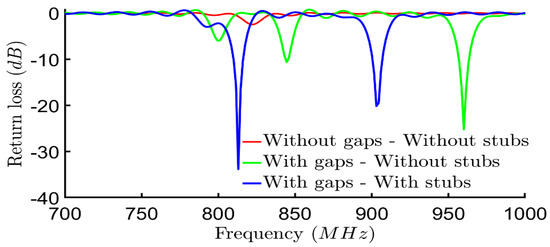 The return loss of the proposed structure vs. different configuration: without stubs without gaps; without stubs with gaps; with stubs with gaps.