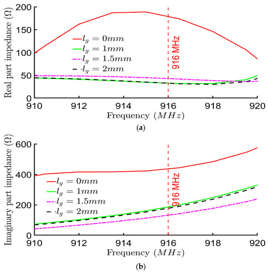 The proposed structure impedance vs. different gap lengths lg: (a) The real part of the impedance; (b) The imaginary part of the impedance.