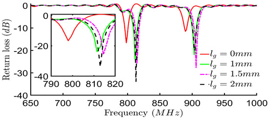 The return loss of the proposed structure vs. different gap lengths lg without stubs.