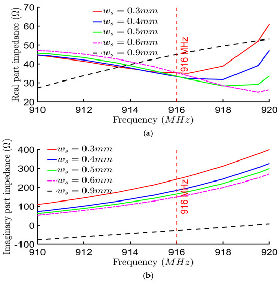 Proposed structure impedance vs. different stub width ws: (a) Real part variation of the impedance; (b) Imaginary part variation of the impedance.