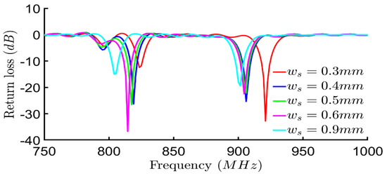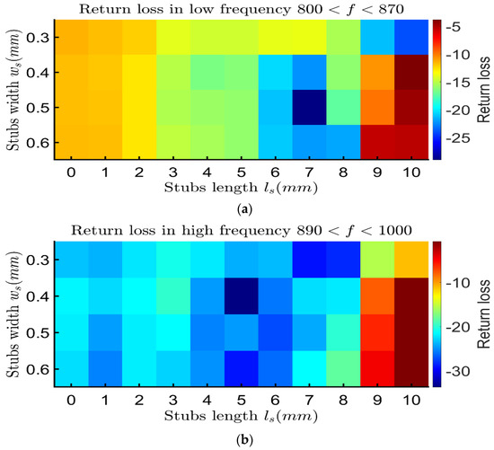 Return loss vs. ls and ws values. (a) at low frequency 800 < f < 870, (b) at high frequency 890 < f < 1000.