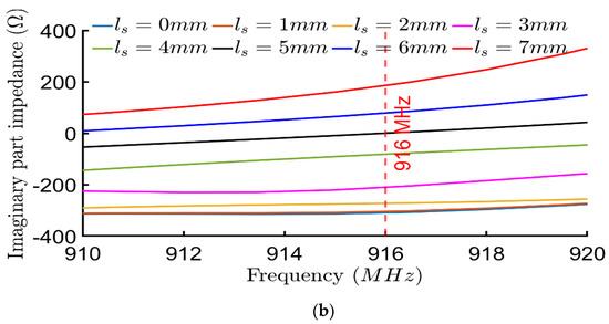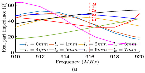The stub length is another parameter that helps control the structure impedance. Figure 12 illustrates how this parameter can affect the structure impedance. It looks difficult to interpret the relationship between impedance real part variations and the stub length ls, however, its interval values go, approximatively, from 20 to 50 Ω at 916 MHz. Concerning the imaginary impedance part, it is clear that it increases significantly as the stub length increases.