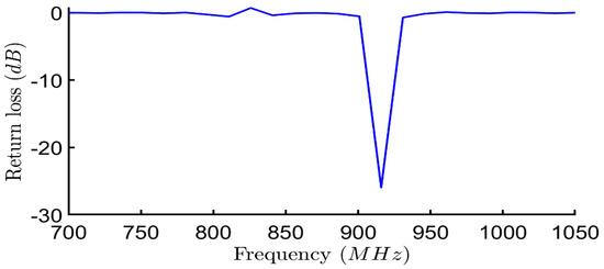 Figure 15 presents the calculated return loss values of the optimal RFID structure when gaps and stubs are set at their optimal dimension’s values: lg = 2 mm, ls = 7 mm, and ws = 0.6 mm, and when it is fed by an MPING M70 chip. This structure achieves a lower return loss value of −22.3 dB in the HF region at 916 MHz which offers a maximum calculated read range value up to 25 m.