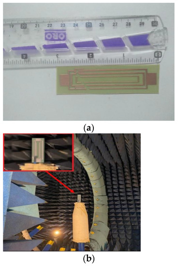 Section 5 aims to validate the simulation study and verify the advantages of adding gaps and stubs to the antenna structure in real applications. For this kind, a prototype of the simulated RFID tag antenna has been fabricated and tested, as shown in Figure 16, using Taconic RF-60 substrate of permittivity 6.12 and a thickness of 1.6 mm. The fabricated tag has a size of 95 × 25 mm2 and includes gaps of length lg = 2 mm, stubs of width ws = 0.6 mm, and length ls = 5 mm.