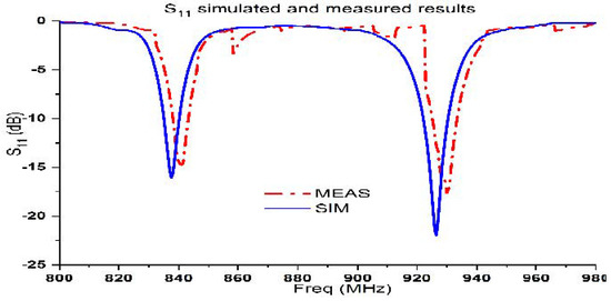Figure 17 presents the measured and simulated results of the reflection coefficient. The two curves are much closer to each other especially around the two resonant frequencies with a slight shift of the measurements toward higher frequency band. Experimental results show that the proposed RFID tag is a dual-band antenna operating at UHF band around 837 MHz (LF region) and around 927 MHz (HF region). In the LF region, the antenna has a measured return loss near to −15 dB at 840 MHz with a 6 MHz bandwidth (838–844 MHz). In the HF region, the measured return loss is even better as it reaches −17 dB at 927 MHz, with a 10 MHz bandwidth (925–935 MHz).