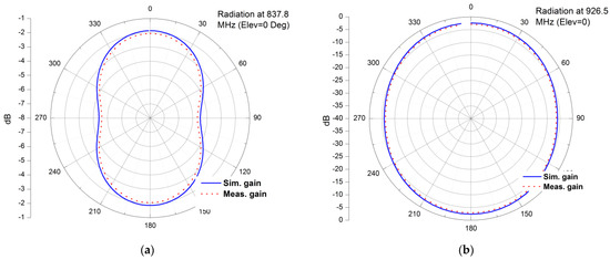 Radiation of proposed RFID antenna. (a) At 837 MHz. (b) At 927 MHz.