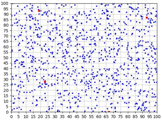 The mobile nodes(MNs) are mentioned when some emergency occurs in the target areas. The algorithm of MSSM addresses these problems. Once the target appears in some regions, it will inevitably cause anomalies in sensor data. The data are then aggregated and transmitted to the cloud servers or other clusters through the wireless network. After computing by the clusters, the mobile nodes respond to SA in accordance with the optimal energy consumption scheduling strategy. In the following experiments, we set different numbers of mobile nodes randomly in an network (for example, the four red symbols of “X” shown in Figure 2), and customize and design a service scheduling strategy for WSNs.