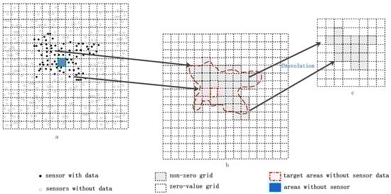 The value of grid data corresponding to the area where the target appears may be zero because of the random distribution or failure of sensors. Figure 3a shows that the irregular area covered by the black points is an SA, and there is a blue grid without any sensor in this region (in fact, this area should also be the subject of our supervision). Figure 3b shows a rough scope of the target combined by gray grids, and the red dotted line marks the boundary of the target; however, there is a blank grid mapping to the blue grid in Figure 3a. Assuming the size of CKM is , through the convolution operation, the grid matrix () in Figure 3b becomes the result matrix of Figure 3c whose size is . Interestingly, the special blank grid in Figure 3b disappears in Figure 3c.