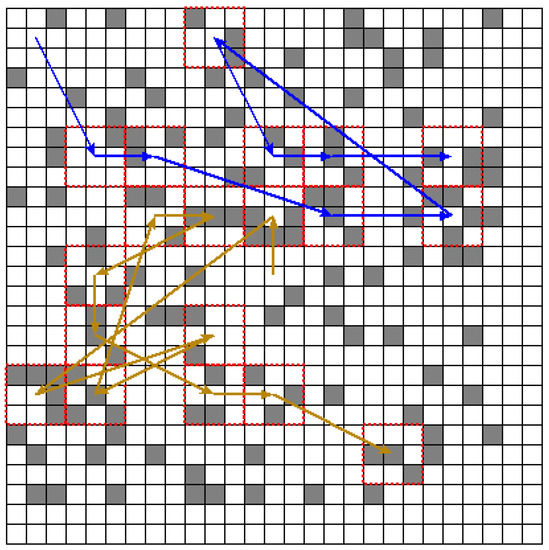 If there are two service nodes, their position is set at and . Since the same scheme is used, 19 SAs in Figure 8b were responded to. One of the nodes deals with 8 SAs, and the other node served 11 SAs. Their paths are drawn by different lines in Figure 10.