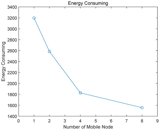 In the experiment in this essay, each node is set at 4000 points as the initial energy, and the energy consumption is calculated according to the distance from the service node to the SA. Figure 11 is the energy change of different numbers of nodes. Judging from the changing trend, as the number of mobile nodes increases, their total energy consumption tends to decrease dramatically.