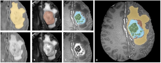 Sub-regions of GBM tumor in MRI modalities. (A) The whole tumor in FLAIR modality (yellow); (B) the tumor core in T1Ce modality (red); (C) the enhancing tumor in T1Ce modality (blue) surrounding by necrotic and non-ET tumor; (D) the total tumor structure in MRI modality [3]).