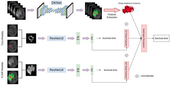 In recent years, much research has been conducted to predict the OS days of GBM patients. Most trending method contains two stages: segmentation and uses radiomics features from the segmented map to predict the survival time. Shboul et al. use the ensemble of random forest (RF) and convolutional neural network (CNN) to obtain the segmented map, and after that, RF predictive model is used to predict the survival days using 240 most essential features out of 1366 features in total based on Kaplan–Meier curve [5]. In [6], Baid et al. use the 3D Unet model with three stages of encoder–decoder architecture to obtain the segmented maps. After that, radiomics features are extracted and fit a multi-layer perceptron (MLP) network for OS prediction. Feng et al. use the ensemble of 3D UNets with the variation of input size, the number of encoder/decoder blocks, and the number of layers to robust the results of the segmentation task. Based on the segmentation result, the volume, shape, and surface area are manually identified and combined with clinical information to obtain OS days via linear regression [7]. In [8], and boosting ensemble of three different networks, including Unet [9], DFKZnet [10], and CA-CNN [11], was applied to obtain the final segmentation result via majority voting. Fourteen selected radiomics features are fit to RF for OS prediction. Madjid [12] et al. found that location-based features efficiently enhance the prediction result. They identify the location-based features by the distance from the tumor to the brain’s center, the largest diameter of the tumor, and the vertical slide number having the most oversized tumor diameter. Combined with the selected radiomics features, the OS prediction result slightly improves. According to [13], deep features are extracted from MRI modalities via a CNN network that describes the tumor’s size, shape, and texture. Further, the NLSE model is proposed with the integration of the non-local module and the squeeze-and-excitation module to robust the segmentation results. Finally, The factor analysis is applied to reduce radiomics features and deep features, and all the remaining features fit the RF regression to obtain OS days.