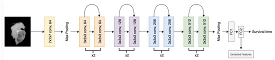 While FLAIR is the best modality for radiologists to see the WT, ET boundaries are best visualized in T1ce [22]. Because of that reason, CNN architecture is utilized to extract the high-level features from FLAIR and T1ce modalities for WT and ET, respectively. First, the MRI modalities are cropped into 128 × 128 × 128 to remove the background voxel. After that, ResNet18 architecture, pre-trained in ImageNet, is applied to extract meaningful information from MRI modalities. ResNet18 has four layers, containing two basic blocks in each layer, followed by two modified fully connected (FC) layers with 512, 101 nodes, respectively. The skip connection is also applied in each convolution layer. The output of ResNet18 is the survival days of patients. The deep features are chosen from the last FC layer of this network, containing the most meaningful features to predict the OS days of patients related to each kind of tumor. The detailed architecture of the network is shown in Figure 4. The feature selection technique is essential for the over-fitting problem reduction in the survival prediction task and keep the most meaningful features related to survival time of patients; therefore, a random forest algorithm is applied to find most of the nine essential features from ET and WT, respectively.