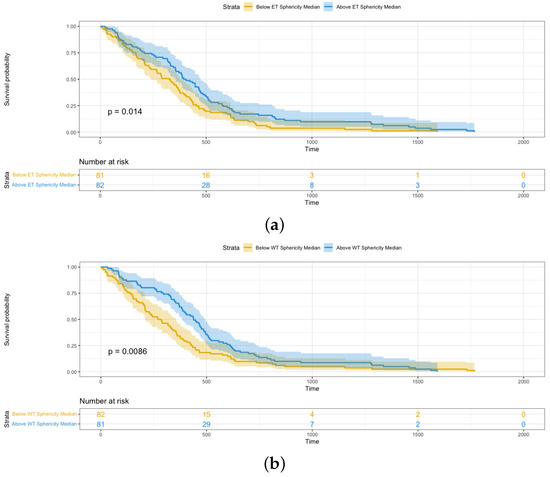 The KM curves of 2 groups for sphericity in ET and WT based on median value, respectively. (a) Kaplan–Meier curve for ET; (b) Kaplan–Meier curve for WT.