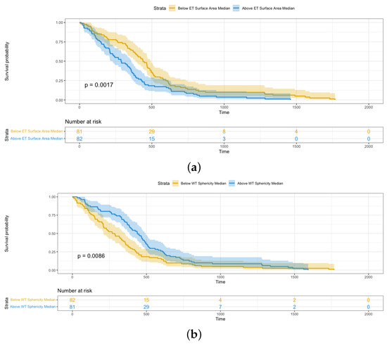 For detail analysis, Kaplan–Meier (KM) estimators are utilized to evaluate the relationship between each feature to survival time of GBM patients. The Kaplan–Meier estimator is a non-parametric method used to measure the ratio of patients living for a specific time after treatment [20]. For experiments, two patient groups are generated based on the median value of each selected feature. Then, KM curves are plotted for both selected shape features for two group patients. Further, the log-rank test is applied to compare the survival function between two groups for each shape feature based on the p-value. If the p-value of the log-rank test is smaller than 0.05, two groups are statistically significant, mentioning different distribution between two groups. According to the KM curve and log-rank test, patients with a smaller surface area, longer 3D maximum diameter, and smaller sphericity ratios have a longer survival time than others for ET and WT tumors. The detail information about KM curves and log-rank test (p-value) for each feature is shown in Figure 5, Figure 6 and Figure 7.