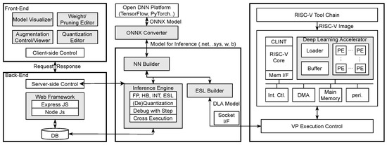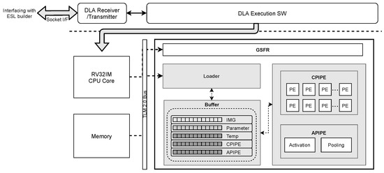 The interworking between the ESL builder and the DLA platform is also described in Figure 5. When the ESL builder transmits a specific neural network model and parameters converted in the format executed on the DLA platform to the DLA platform through the socket interface, the DLA Receiver/Transmitter of the DLA platform receives the corresponding information. This information is then delivered to the DLA execution SW, and it performs neural network operations through the DLA module. To execute neural network operation in the DLA module, a RISC-V-compiled software is required. The DLA execution SW is the software compiled by RISC-V toolchain, and thus can be executed on the RISC-V core. After completing the neural network operation, the results are then sent back to ESL builder via the DLA Receiver/Transmitter.