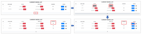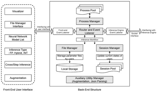 To provide those features, the back-end part of GUI platform consists of five modules as shown in the right part of Figure 2: Router and Event Listener (REL), Process Manager (PM), File Manager (FM), Session Manager (SM), and Auxiliary Utility Manager (AUM). REL is responsible for the main request processing function as the manager of the platform. Since all functions of the platform, such as file management, inference selection, weight editing, image augmentation, and image visualization, are visually expressed in a web browser, it performs event service routines according to various requests from other parts. The back-end event listener receives the user’s configuration for the neural network model through internal socket interface from the front-end part, and REL executes the neural network operation of the model to the interface engine based on this information. The inference engine event listener interacts with the inference engine through socket communication. It receives the results of the inference engine and stores the results in the file storage space through the file manager.