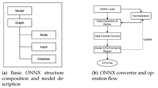 ONNX is described as Google’s Protobuf [32] and supports about 200 operations corresponding to the layers of the neural network. The definition of a model in a neural network is not simply a list of data, but requires additional description of what the data means. Figure 3a shows the main components of ONNX, in which important information in ONNX model configuration are Node, Input, and Initializer, shown in the figure. Node generally acts as a layer in a neural network, Input represents dimension information of a matrix, and Initializer stores weights. Each element is a hierarchical object structure, and a model is constructed by grouping related objects into a doubly linked list. Our framework provides an ONNX converter, which converts the ONNX model into deep learning models executable in our inference engine. The ONNX converter uses the ONNX model to create networks, weights, bias, etc. according to the format suitable for NN builder. Figure 3b shows the operation flow of the implemented ONNX converter. It consists of four steps: ONNX Load, data extraction and purification, conversion to specific model format, and CFG format creation. The ONNX loader plays the role of loading the ONNX model file. After loading the ONNX model file, in the data extraction and purification process, it traverses all the nodes, inputs, and initializers inside the ONNX model to extract information about the layer type, name matrix size, and so on. During extraction, the ONNX model data is normalized to be fixed as the proper model input format. The extracted and refined information is converted into a form that can be managed collectively by putting the entire layer information in one internal object. After that, it is finally converted into a CFG file format that can be used in the inference engine.