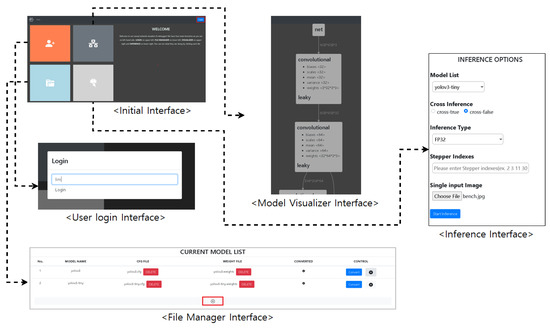 The initial interface of the framework and the arrangement of interfaces for each function are shown in Figure 6. As shown in the figure, the initial interface has four elements according to each function: user login, visualizer, file manager, and inference. The user login is an interface for user management, and the visualizer is a user interface that graphically displays information about the network model being used. File manager is an interface to manage neural network models in the framework. As shown in the figure, the users may create, delete, and manage neural network models through the file manager interface. The inference interface executes inference operations of the selected model among several models in the framework. This GUI interface provides configuration options to set model selection, cross inference, inference parameter type, and stepper option for layers, so users can try to perform inference operation according to the configuration.