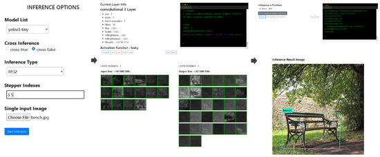 As an example of application to the framework, an object detection application called Darknet [36], which is widely used for object detection in embedded edge devices, is applied to our framework by applying the model converting of Darknet yolov2, yolov3, and yolov3-tiny into our framework. We performed various features such as visualization, file management, inference, and so on, and it was identified that most of the features provided by the framework operated normally. The summary of applying features for several versions of Darknet object detection deep neural network application to our framework is shown in Table 1. As shown in the table, it is identified that most of the features provided by the framework are operated normally. The features include file management, inference method including hybrid inference, stepping inference, and cross inference with different type of parameters, and visualization of the network model. In addition, the framework also has augmentation features. The features such as visualizer, file manager, and augmentation are functional parts, and the functions operate normally. For the inference, it indicates whether object detection is performed properly through the framework. In the case of yolo2 and yolov3, inference results were not obtained properly by the cross inference, which we need to analyze the networks with parameters of cross inferencing. For the case of yolo3-tiny, all the features of our framework were properly executed. The inference operations with hybrid, stepping, and cross settings give proper results, and we could analyze the inference results.