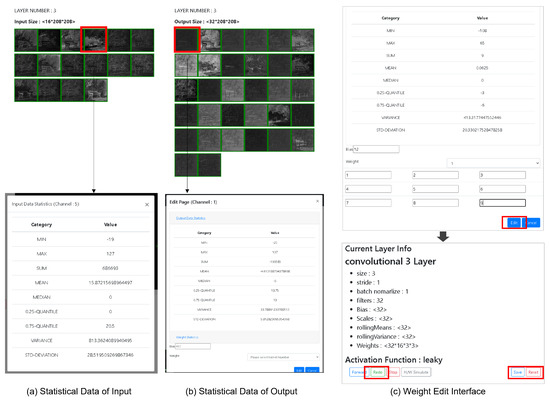 We can analyze the inference operation on a specific layer with the statistical information of the input and output as well as the resulting images. As an example of the result, Figure 9 shows the results of performing the inference operation on layer 3 of the yolov3-tiny neural network model. As shown in the figure, for a specific layer of the neural model, it can be analyzed by displaying the inference operations according to the configuration of the layer. In addition, individual statistical analysis of the input data and output data of the corresponding layer is possible. As shown in Figure 9a,b, layer 3 of yolov3-tiny is a convolution operation that generates 32 output channels for 16 input channels having a size of 208 × 208, so the framework displays the result as an image for each channel and individual statistical information is identified by clicking the image of the corresponding channel in both input and output.