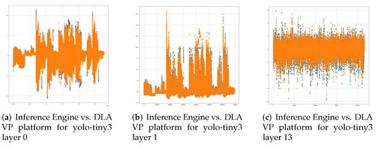 Comparison of each pixel values of inference operation with inference engine and DLA VP platform that execute layers 0, 1, and 13 of Darknet yolov3-tiny: (a) CNN of 416 × 416 size with 16 filters, (b) max pooling of 416 × 416 size, (c) CNN of 13 × 13 size with 1024 filters. In the figure, pixel values of inference engine are plotted with blue points while pixel values of DLA VP are plotted with orange points.