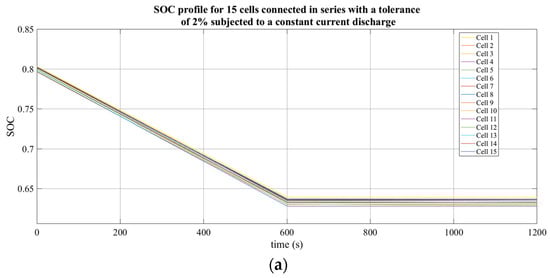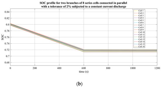 SOC unbalance for a constant current discharge: (a) 15 cells series connected (b) 8 series cells parallel connected.