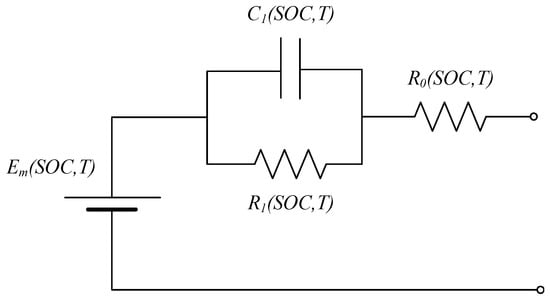 The electrical model used in this paper is shown in Figure 4. A single RC branch model is used where each component is written as a function of SOC and of the temperature T [34]. The temperature has been calculated using the previous thermal model.