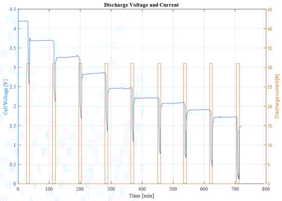 The analyzed Li-ion cell is a 31 Ah NMC pouch cell, whose specifications are reported in Table 3. The cell was iteratively tested with the pulse discharge characterization tests, subjected to partial constant current discharges followed by a rest phase to recover the Open Circuit Voltage (OCV), as in Figure 5.