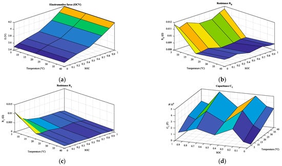 The electromotive force is mainly influenced by SOC and, practically, it does not change with temperature. Both resistances show lower values for middle SOC and they increase when temperatures decrease, which hinders the cell reaction. The capacitance, that accounts for the cell transient response, increases with temperature and it also shows two peaks around 20% and 80% SOC, which might be due to the internal phase transitions of the cell components.